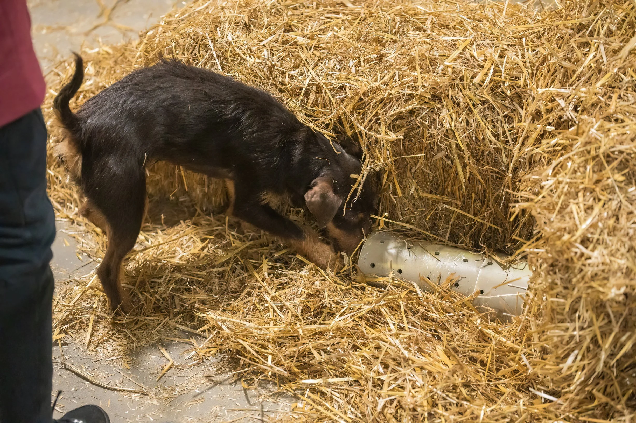 The dog must locate one rat, navigate a simple tunnel, and climb at least one bale in 2 minutes.